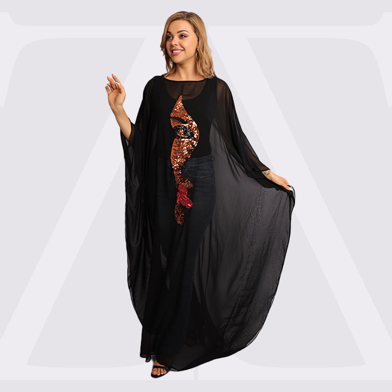 چلابية شيفون - تطريز چلابية شيفون شفاف بدون بطانة بأبليك تطريز وجوه ترتر فري سايز تناسب ٧٠ك...