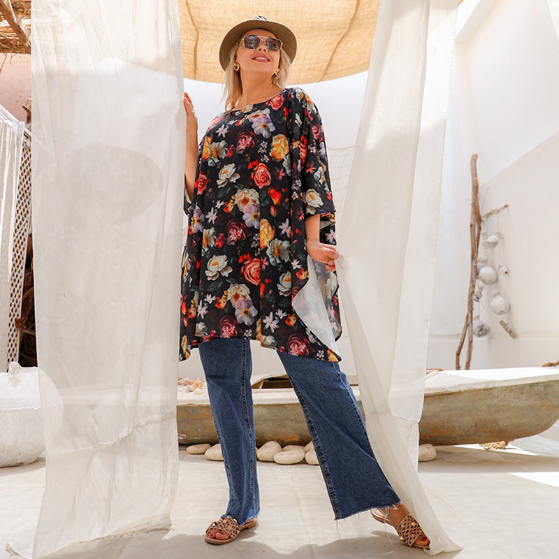 بونشو شيفون بدون بطانة مطبوعة ديجيتال من تصميماتنا الخاصة فري سايز يناسب ٧٠ك إلى ١٣٠ك