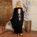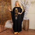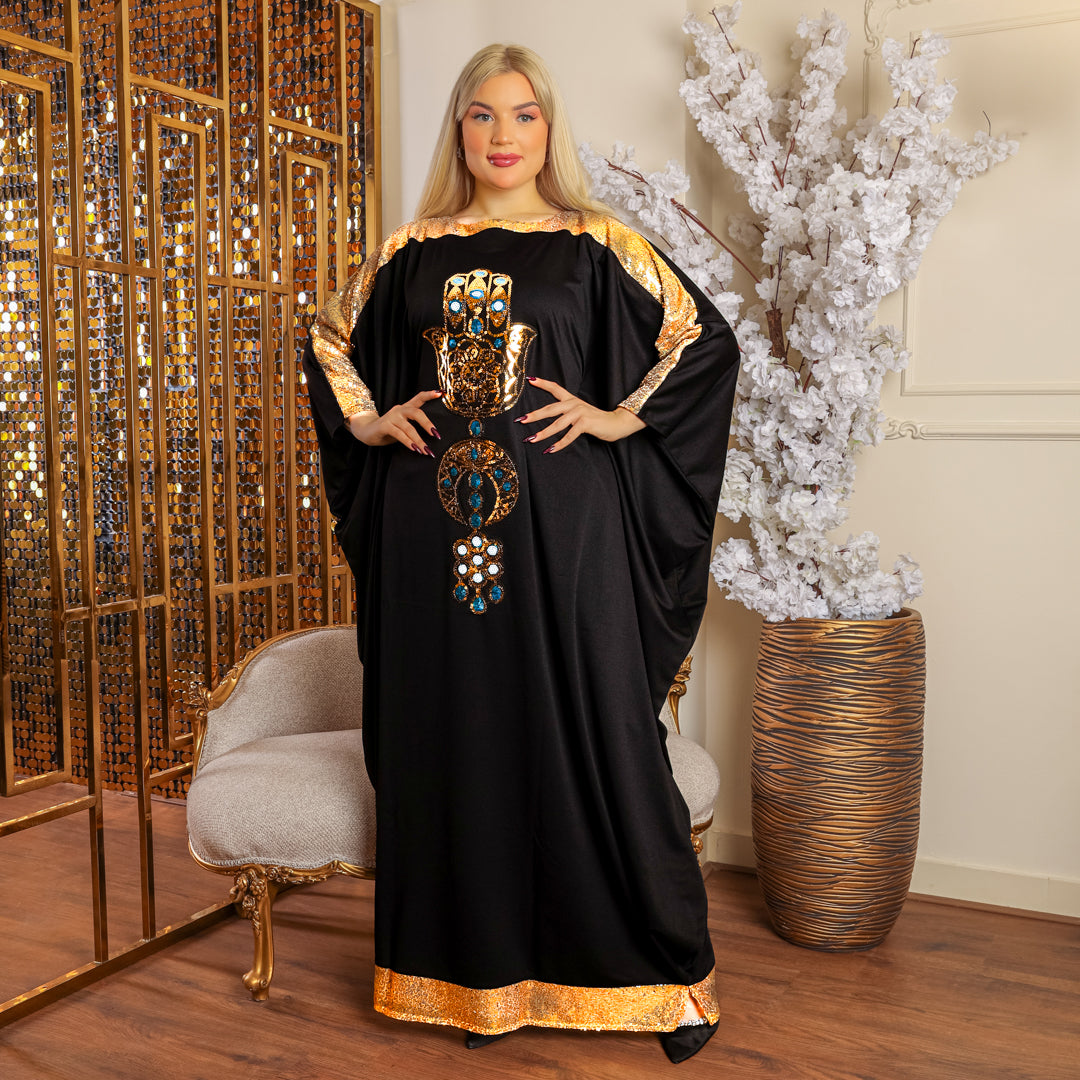 Jalabiya with Arabic sequin embroidery, made of crepe and Lycra material. Free size, fits 70 kg to 130 kg, and length from shoulder 150 cm.