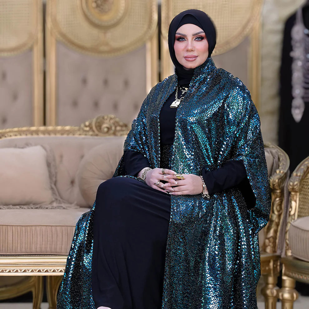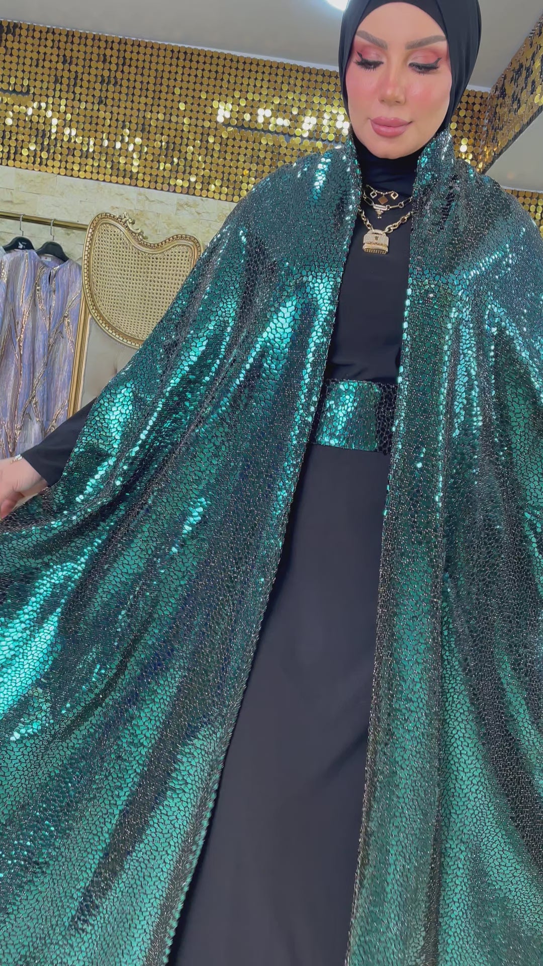 This elegant Soirée gown is adorned with shiny crystal embellishments, paired with a matching belt to highlight a central arabic design.