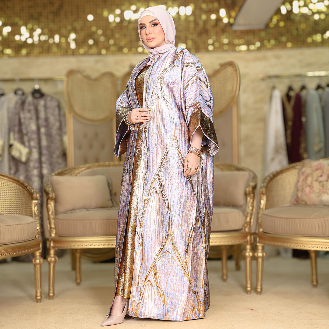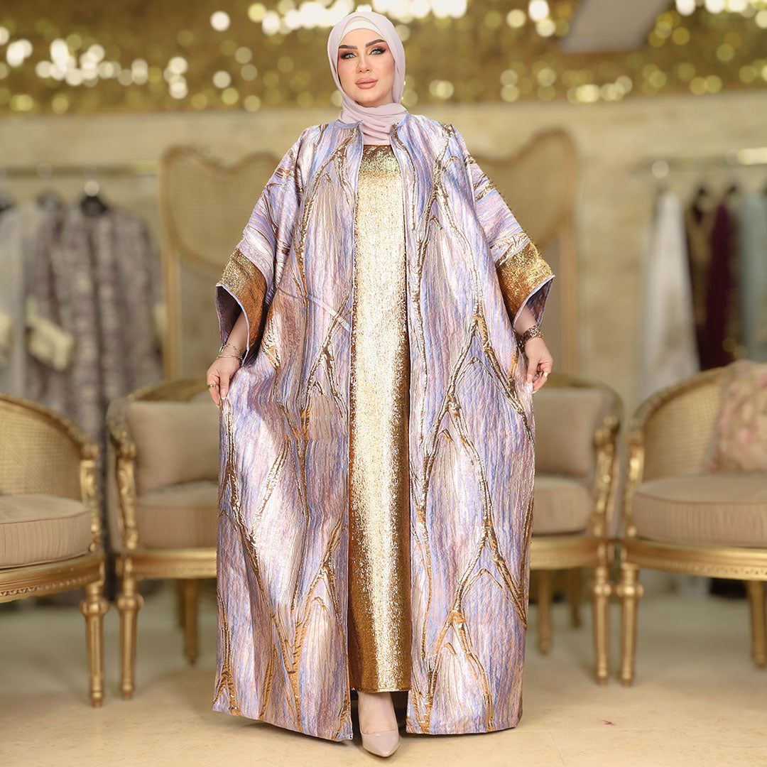 This elegant two-piece Brocade Bahraini Kaftan Set Shiny with basic gold brocade