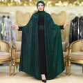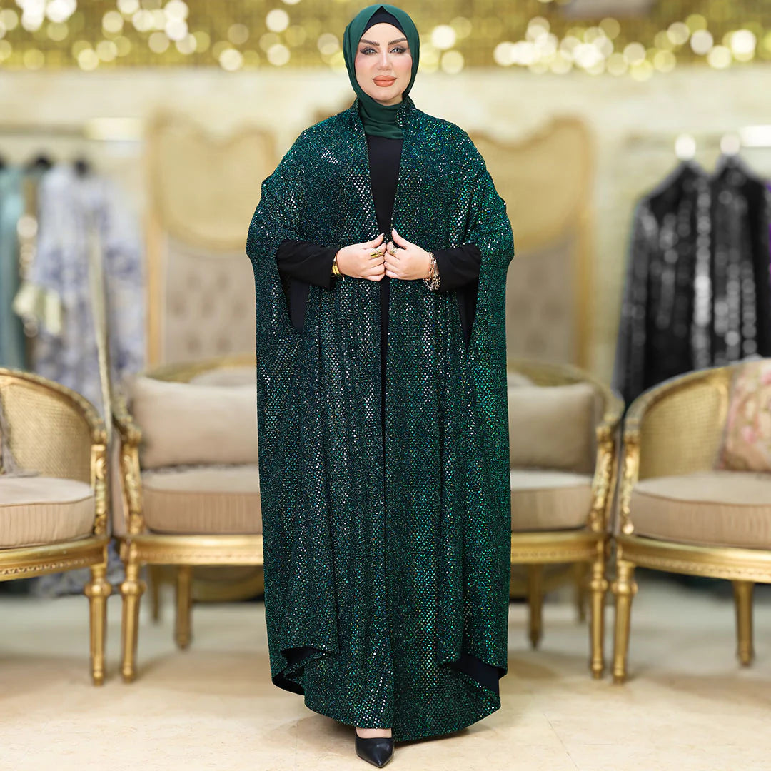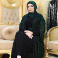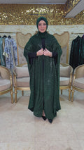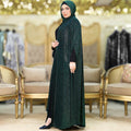 This elegant Soirée gown is adorned with shiny crystal embellishments, paired with a matching belt to highlight a central arabic design.