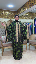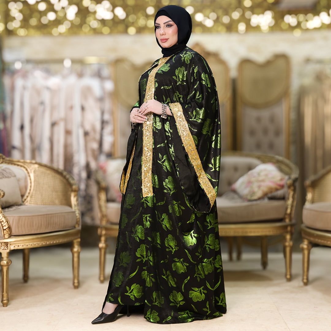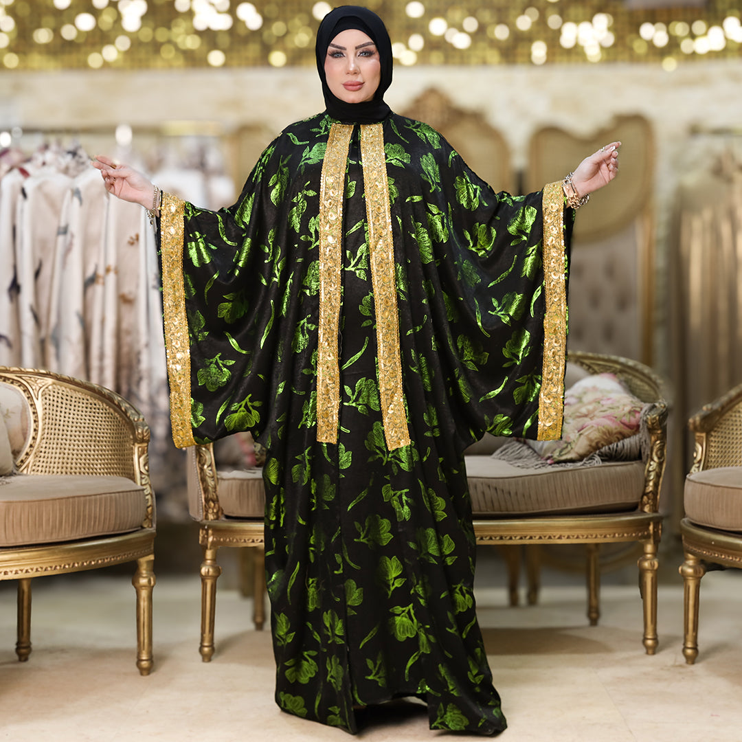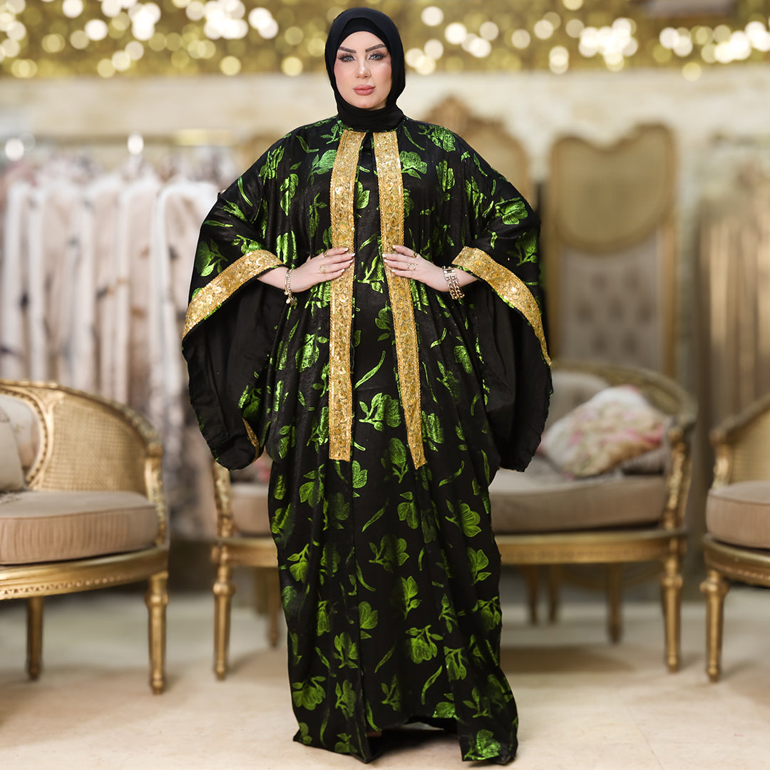 This elegant two-piece Bahraini kaftan set Metallic Armani ,adorned with Indian embroidered trim, paired with a matching basic made from the same fabric.