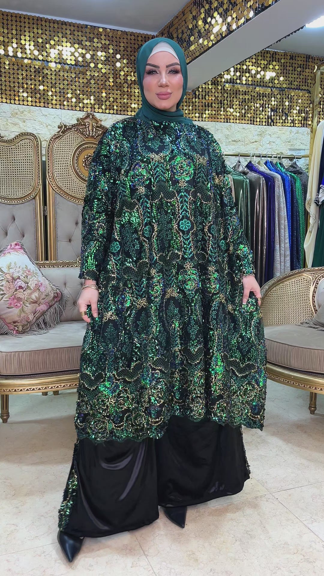 two-piece soirée suit is made from organza fabric,with a French velvet lining