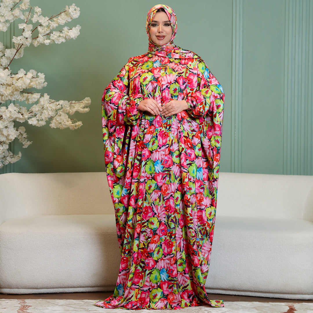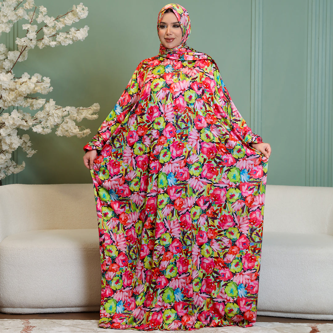Practical Silky Satin prayer dress (Isdal) (digital print our own designs) Free Size fits 70kg to 130kg With a connected veil