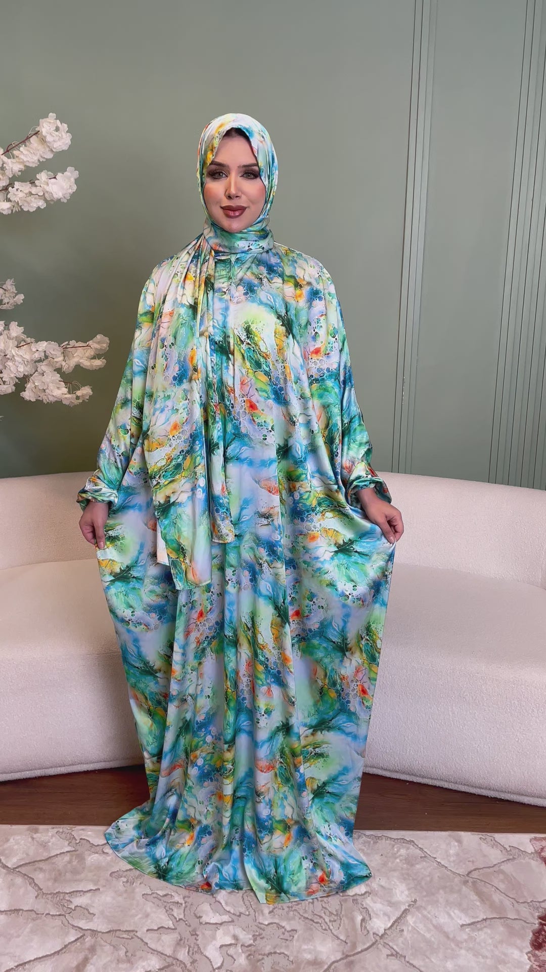 Practical Silky Satin prayer dress (Isdal) (digital print our own designs) Free Size fits 70kg to 130kg With a connected veil