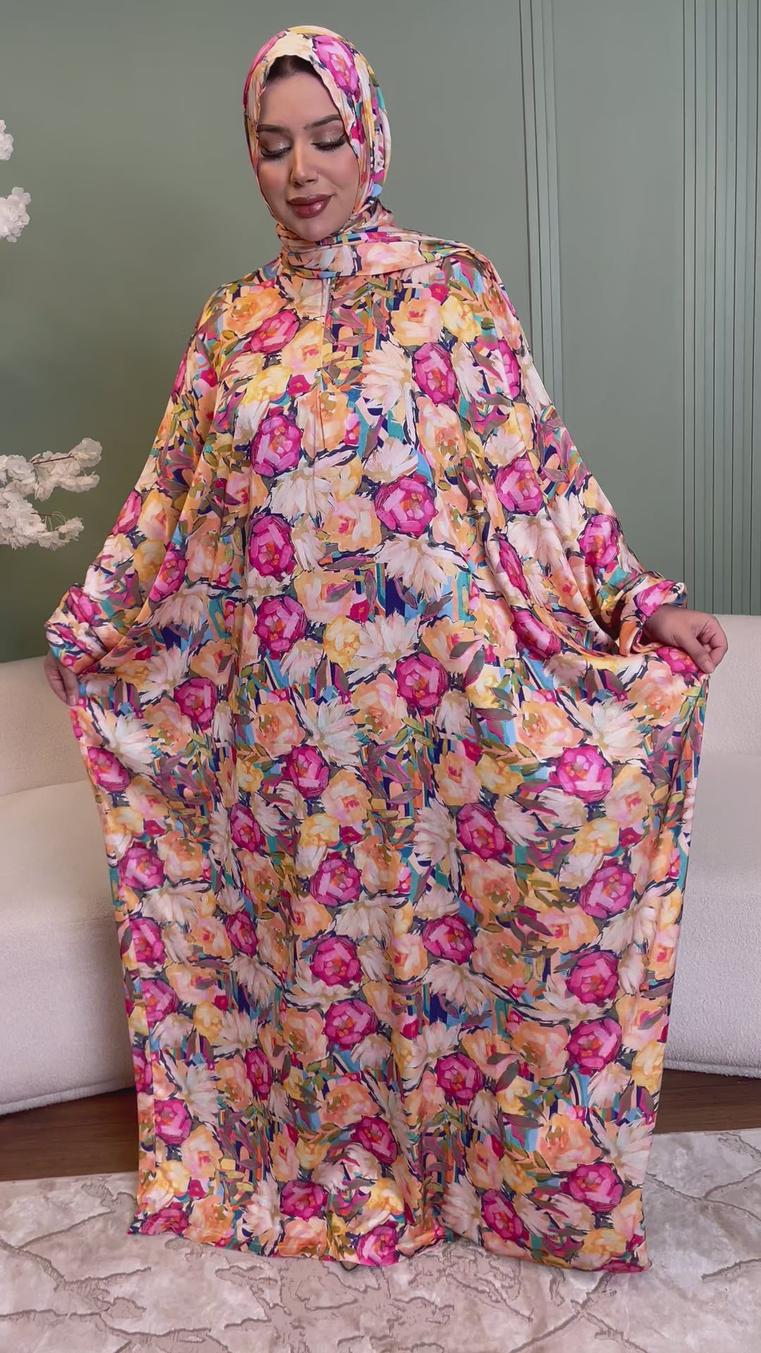 Practical Silky Satin prayer dress (Isdal) (digital print our own designs) Free Size fits 70kg to 130kg With a connected veil