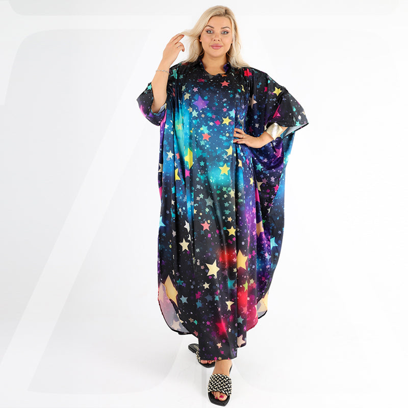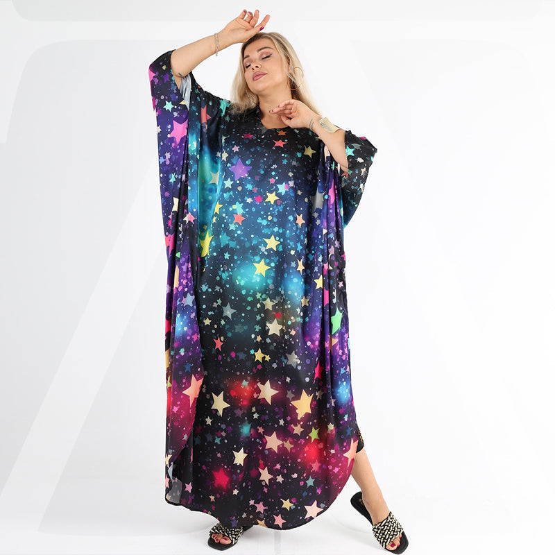 Silky Satin dress ( Armani) dress with digital printing from our own designs, free size, fits 70 kg to 130 kg, butterfly design