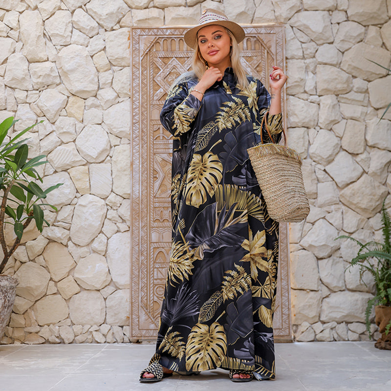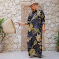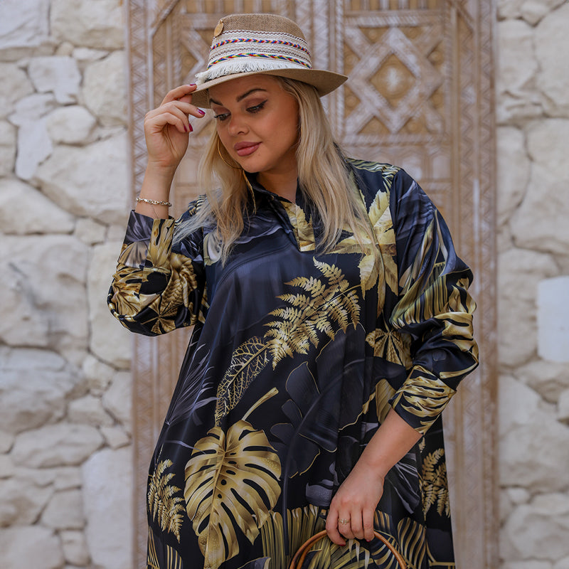 Silky Satin dress ( Armani) dress with digital print sleeves from our own designs. Free size, fits 70 kg to 90 kg and length from shoulder 140 cm.