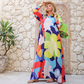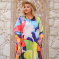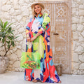 Silky Satin dress ( Armani) dress with digital print sleeves from our own designs. Free size, fits 70 kg to 90 kg and length from shoulder 140 cm.