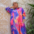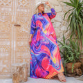 Silky Satin dress ( Armani) dress with digital print sleeves from our own designs. Free size, fits 70 kg to 90 kg and length from shoulder 140 cm.