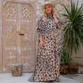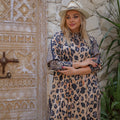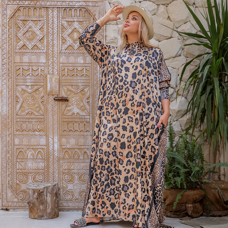 Silky Satin dress ( Armani) dress with digital print sleeves from our own designs. Free size, fits 70 kg to 90 kg and length from shoulder 140 cm.