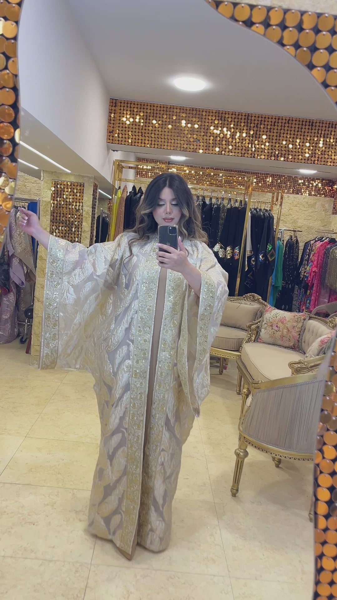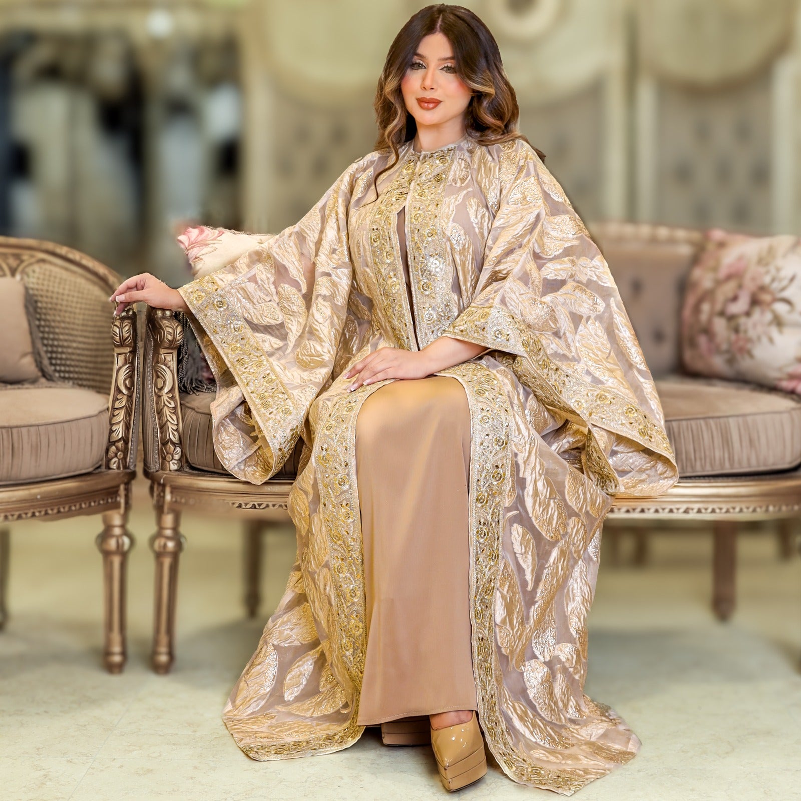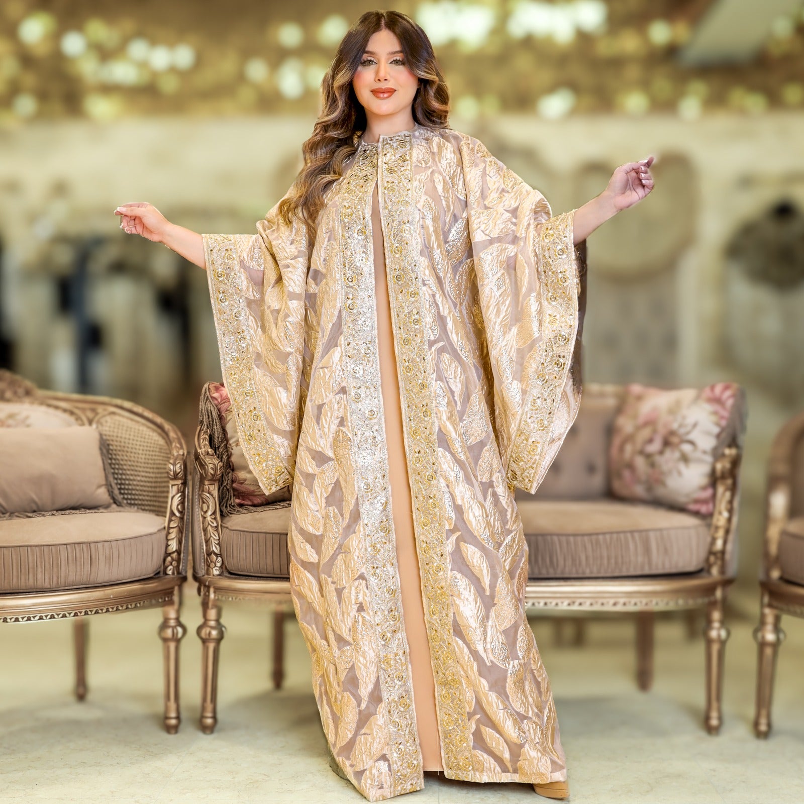 قفطان بحريني من قماش البروكار المطرز و شريط هندي تطريز - فري سايز يناسب ٧٠ك إلى ١٣٠ك