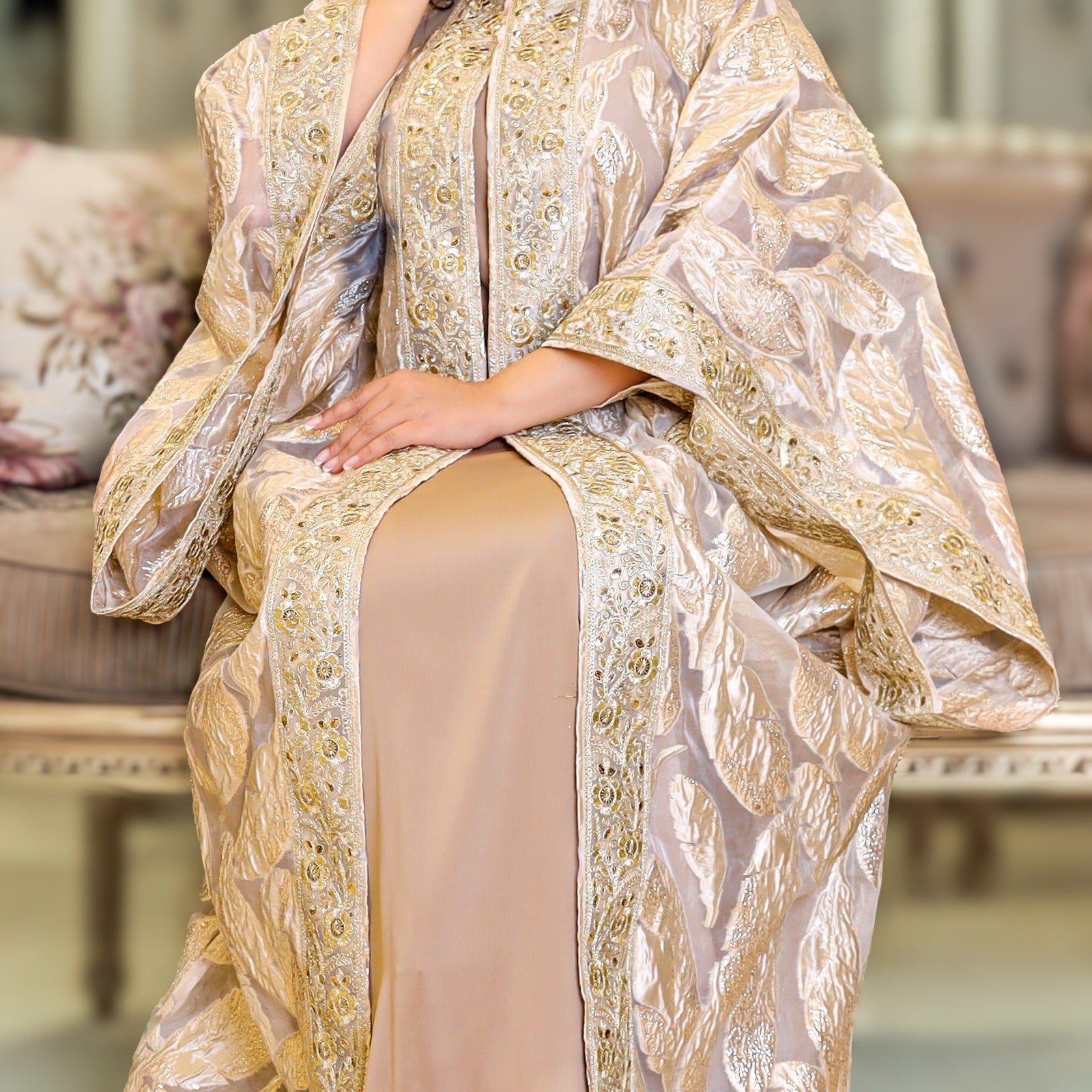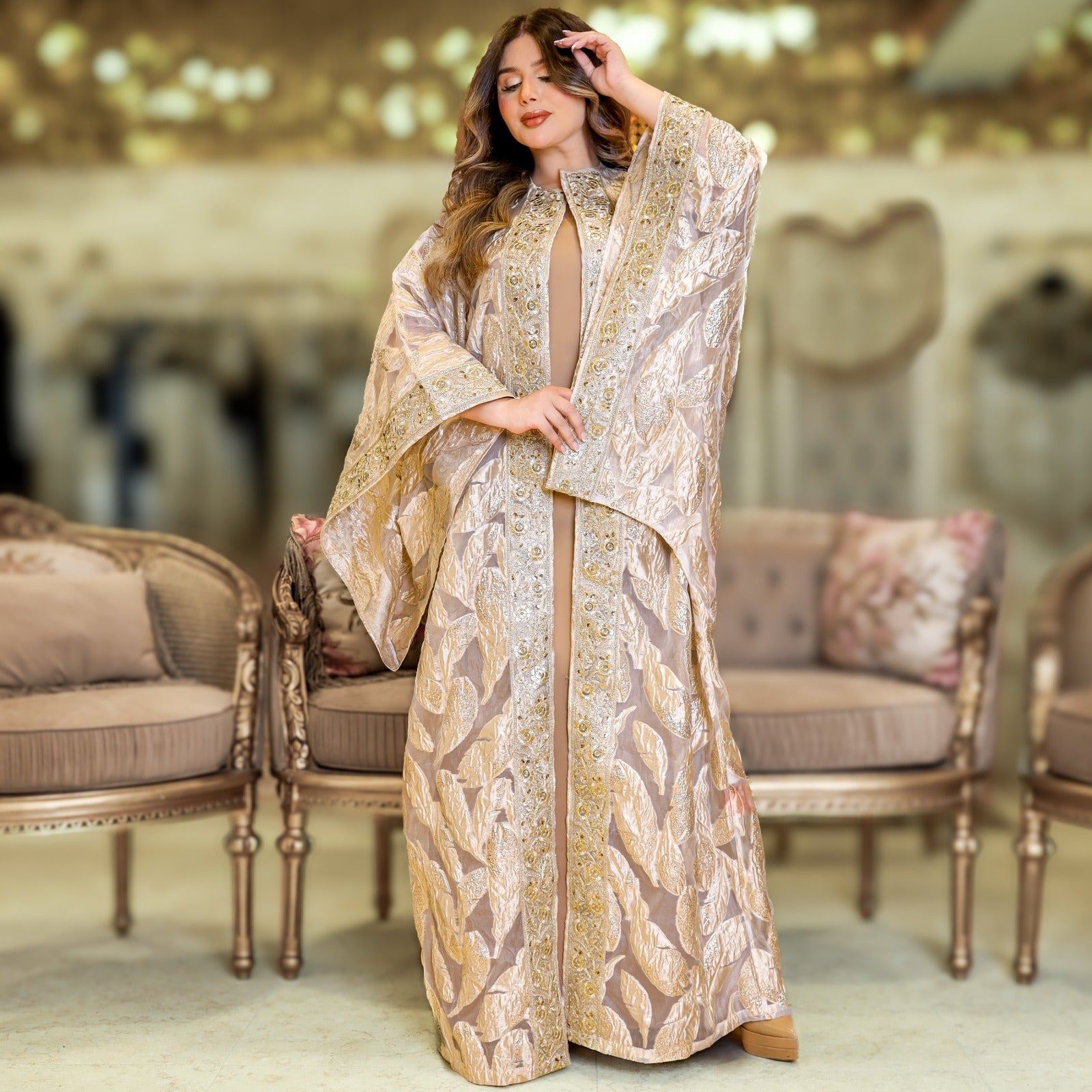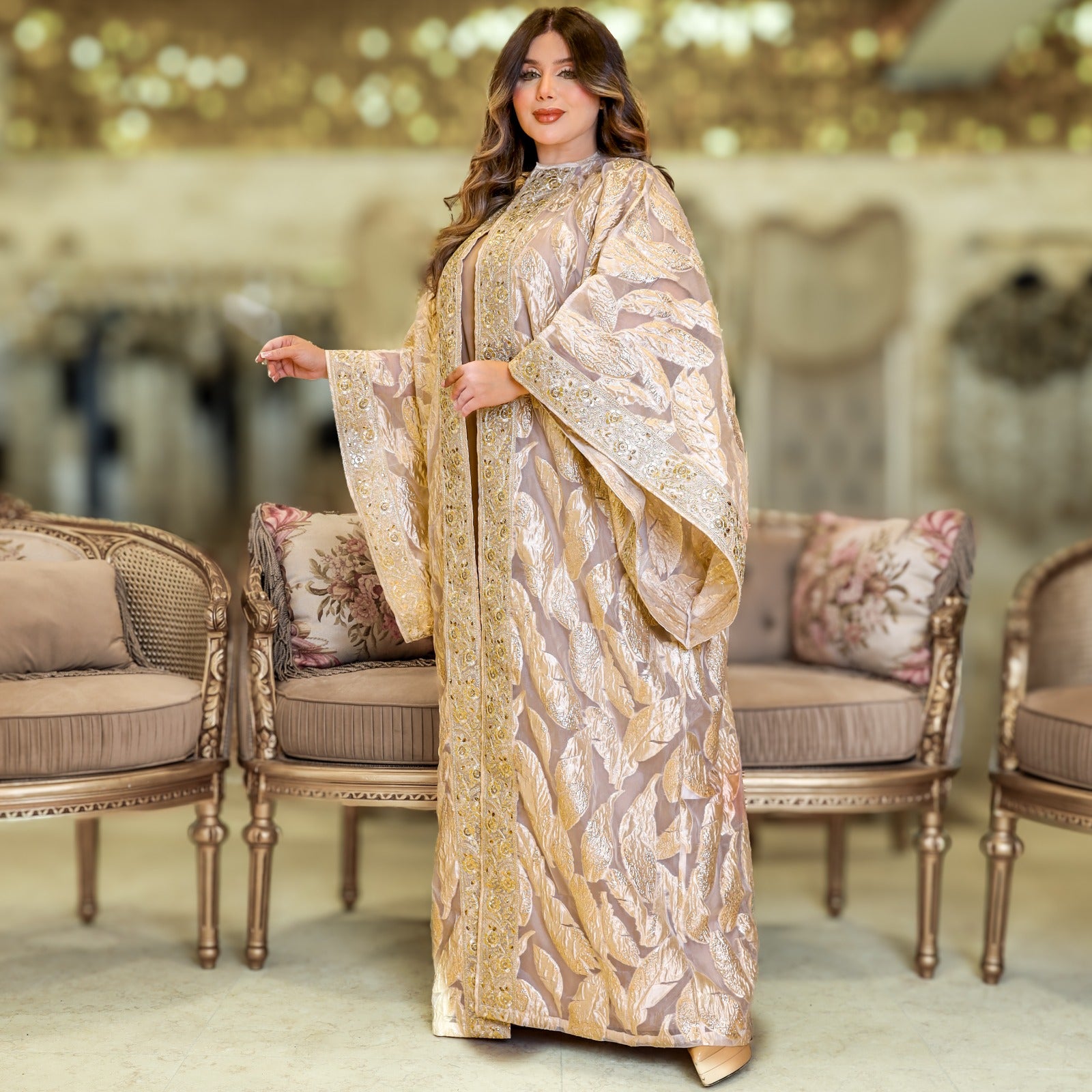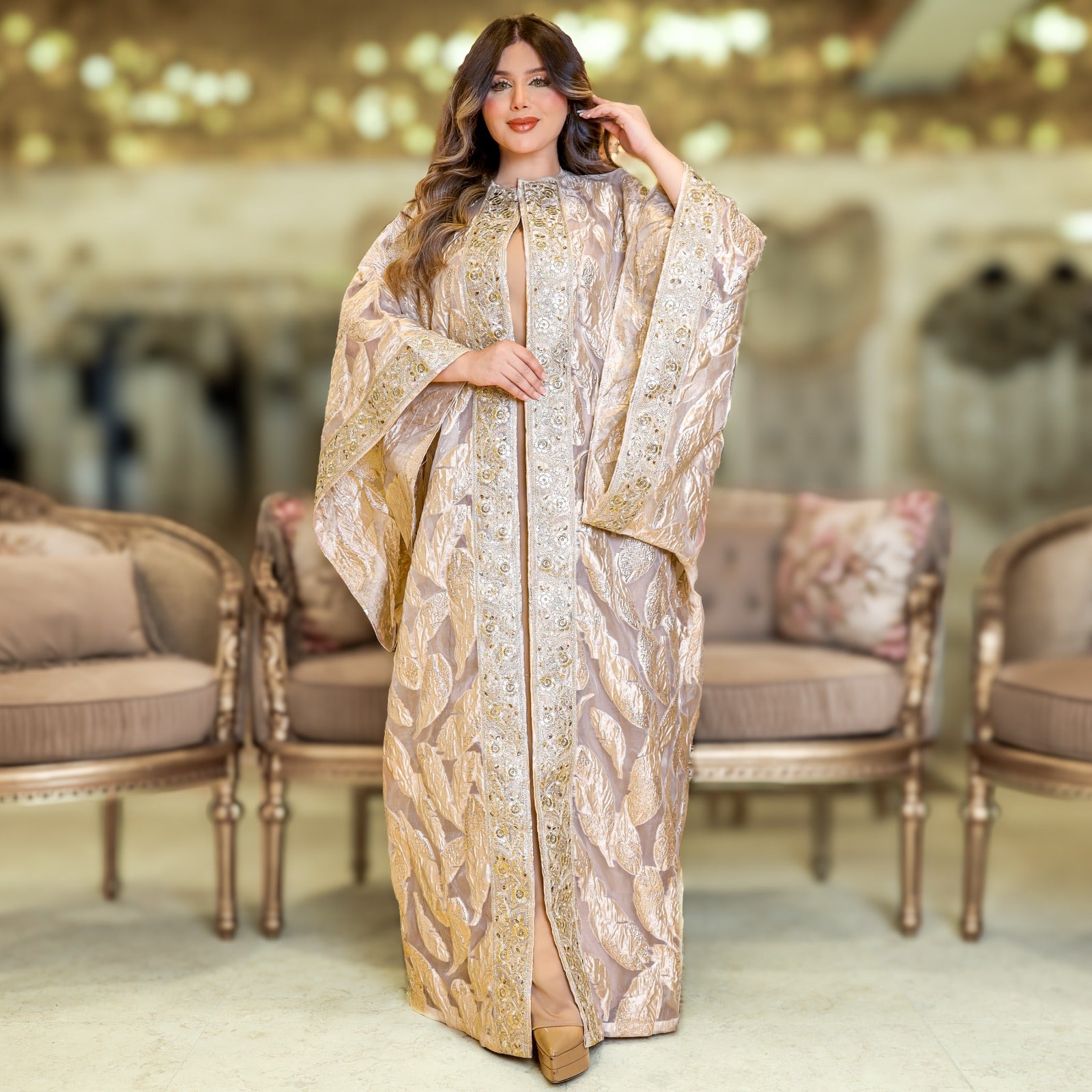 قفطان بحريني من قماش البروكار المطرز و شريط هندي تطريز - فري سايز يناسب ٧٠ك إلى ١٣٠ك