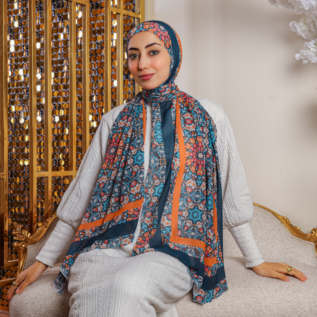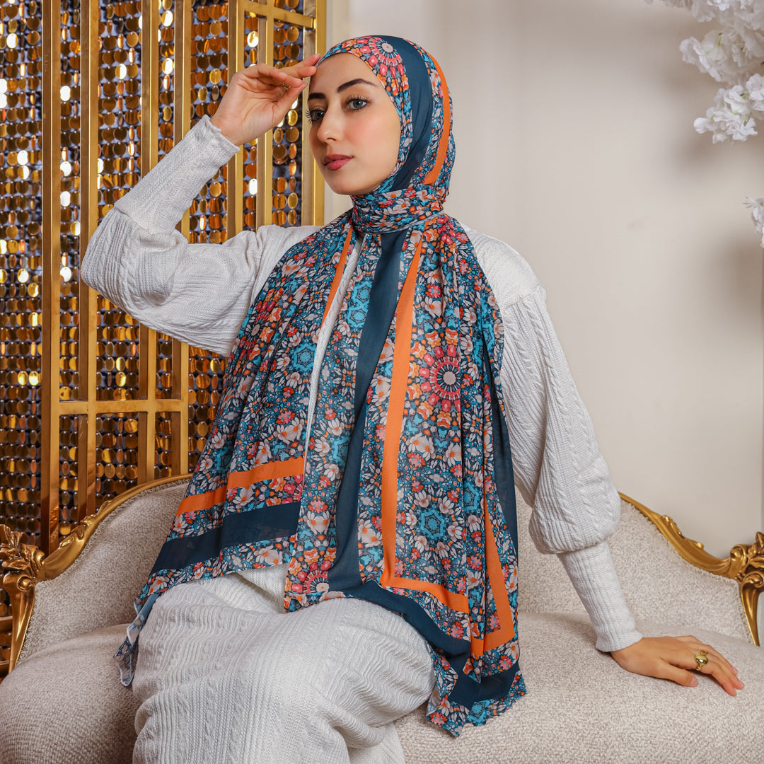 شيلة كريب شيفون خفيف تصميم و طباعة ديجيتال من تصميماتنا الخاصة ٢٠٠سم × ٧٠ سم