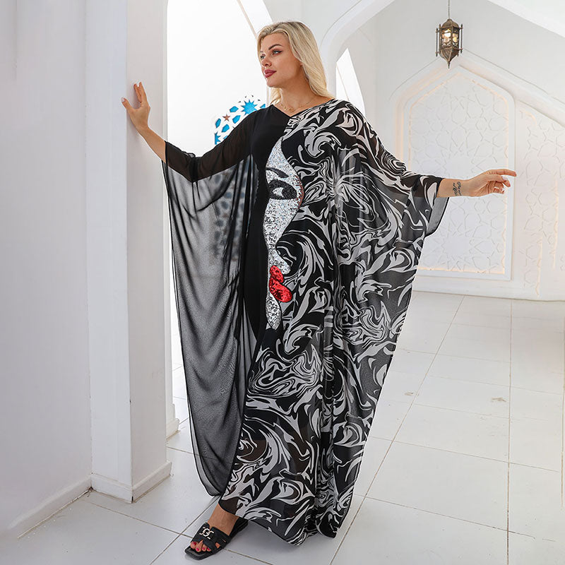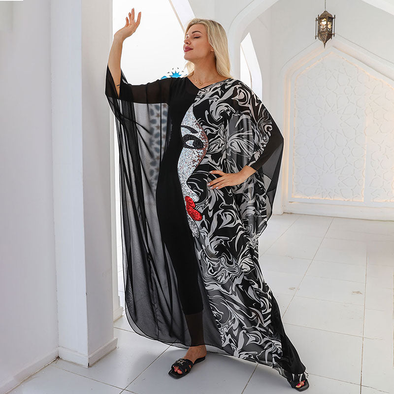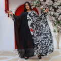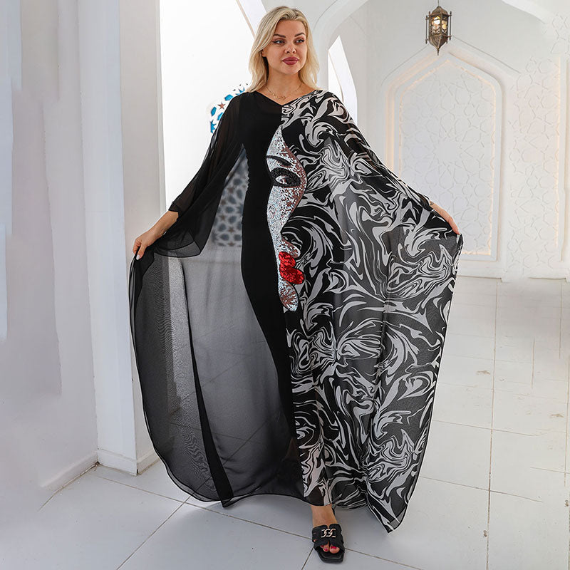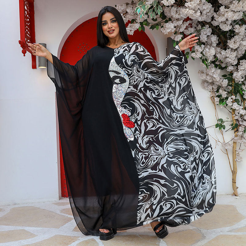 چلابية شيفون شفاف بدون بطانة بأبليك تطريز وجوه ترتر