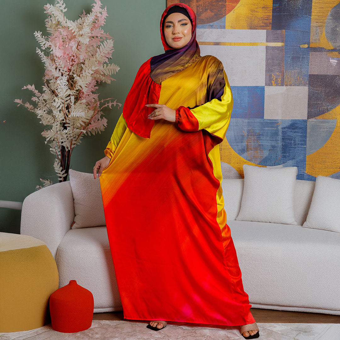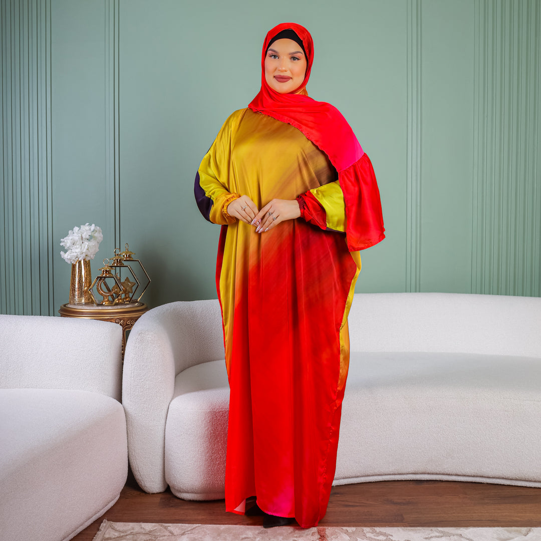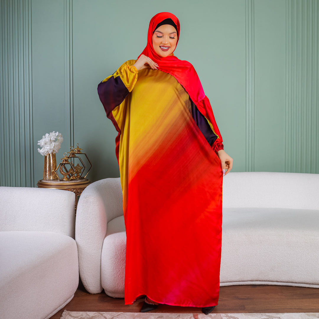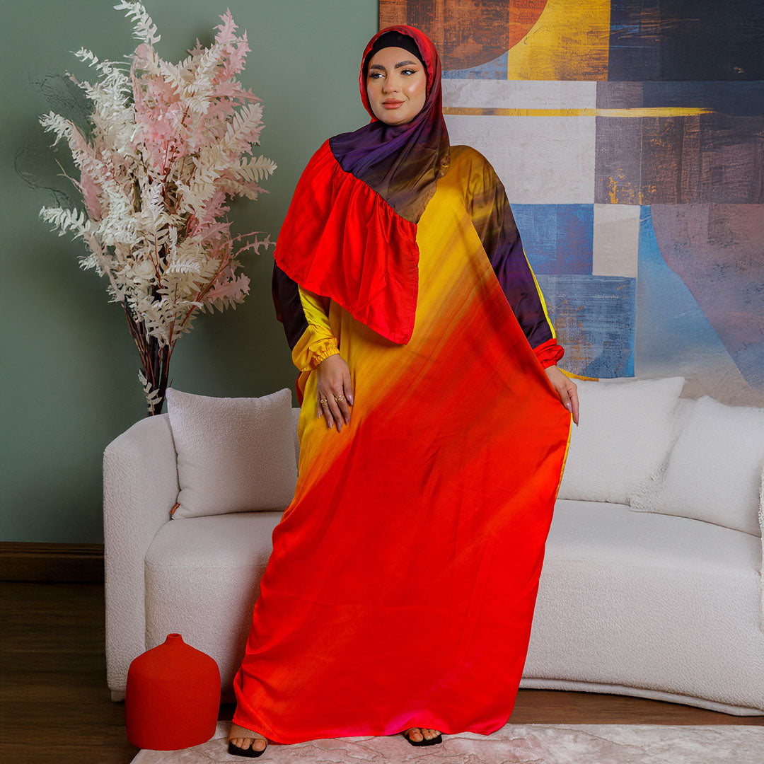ثوب صلاة (إسدال) حرير ستان عملي مطبوع من تصميماتنا الخاصة فري سايز يناسب ٧٠ك إلى ١٣٠ك بطرحة متصلة