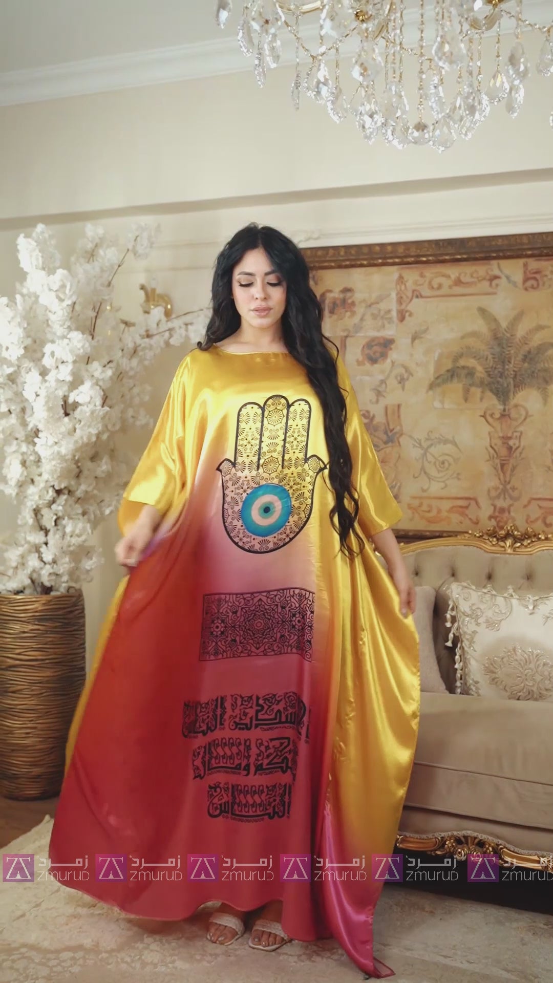 چلابية حرير ستان طباعة ديجيتال من تصميماتنا الخاصة فري سايز تناسب ٧٠ك إلى ١٣٠ك